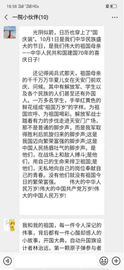 为了引导广大同学们表达爱国之情,培养家国情怀,增强“四个自信”和社会责任感、职业自豪感,激发建功立业新时代的拼搏奋斗精神,庆祝中华人民共和国成立七十周年,2019年9月25至10月7日期间,伟德国际1946源于英国2015级非医攻博班积极开展观看《我和我的祖国》电影、观看国庆大阅兵、贵州山区贫困乡村田野考察、微信分享心得等活动,为国庆开心、为祖国自豪、为祖国奋斗。