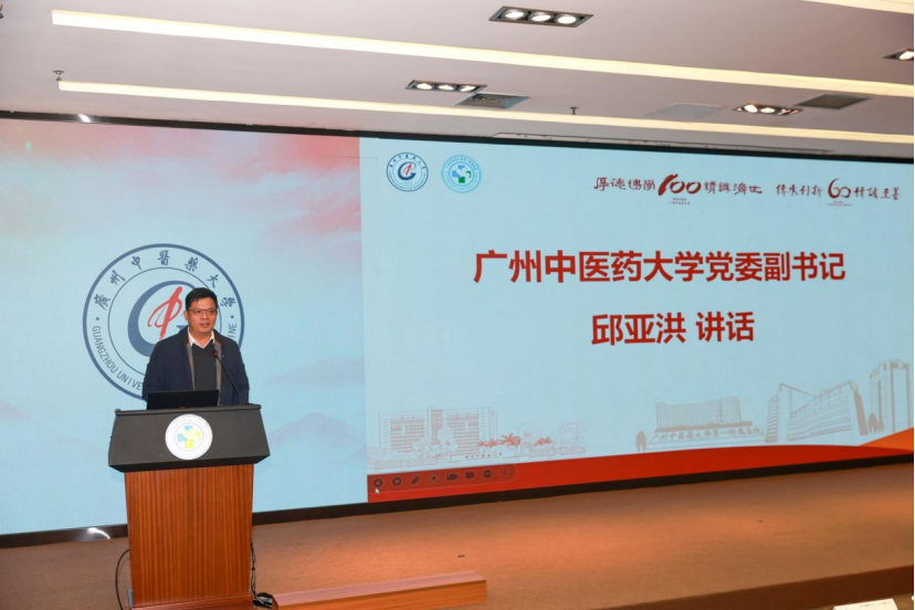 最后,是大学党委邱亚洪副书记讲话,他指出广州中医药大学从1924年9月创办的广东中医药专门学校一路走来,百年办学历程从未间断,育人兴邦薪火相传。近年来,学校坚持党建引领,赋能学校高质量发展,坚持“赛马比拼”,集中火力破解学校事业发展难题;牢记“国之大者”,全面提升人才培养质量;优化学科布局、科技创新再攀高峰、发挥附属医院龙头作用。一代又一代广中医人始终与国家、民族同呼吸、共命运,用仁心仁术与铮铮铁骨扛起中医药事业发展的大任,走出了一条建设“中国特色、世界水平”一流大学的奋斗之路。