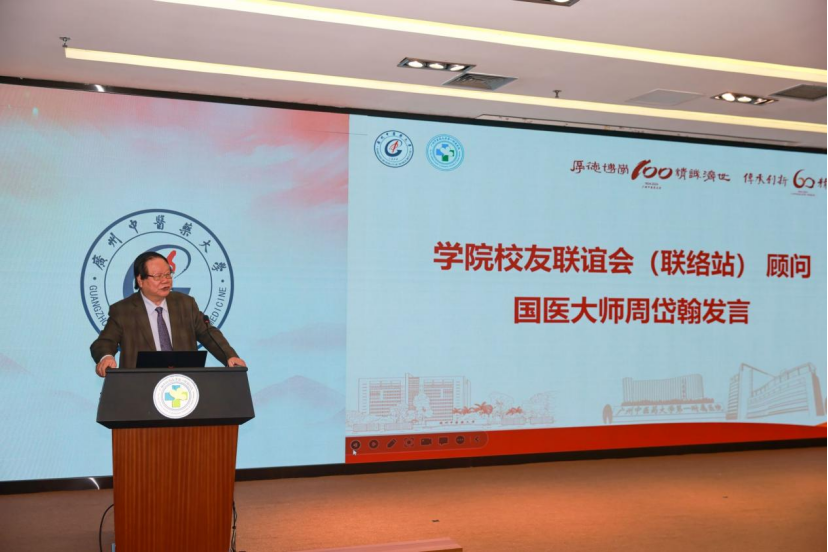 而后是学院优秀校友代表发言。第一位发言的校友代表、学院校友联谊会理事代表陈梓欣老师发言,她通过回忆从踏入校园逐渐转变成为拥有“厚德博学,精诚济世”校训精神的广中医人,再到目前在中医药科研岗位上发光发热的成长历程。她提到了学院校友联谊会既为校友们提供优秀的交流合作机会,又是一院“精诚”文化传承创新的精神纽带,希望能积极举办丰富内涵的活动更好服务校友、反哺母校、回馈社会。第二位发言的校友代表、学院校友联谊会名誉会长林培政教授发言,他以自己的学习经历开篇,为我们呈现了一位优秀中医人的勤奋好学的求学之路,他还分享了自己在毕生研究中所得出对温病的感悟,提出了要为中医发展理论、发展学术,同时要对中医药、中西医结合治疗疾病充满信心。第三位发言的校友代表、学院校友联谊会顾问、国医大师周岱翰教授发言,周老首先回顾了自己在广中医的求学岁月,他领略到中医的博大精深,也体验到临床的酸甜苦辣,深深感受到中医的魅力,也坚定了他从事中医事业的决心。之后,周岱翰教授表明了自己对中医肿瘤事业发展的殷切希望。他认为学院和校友联谊会是联系校友感情的纽带,更是推动校友事业发展的桥梁,校友们要共同为大学和医院的发展贡献自己的一份力量。