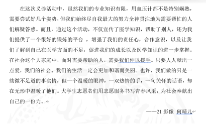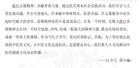 与时代同行,做时代先“锋”。在续写雷锋日记活动中,同学们以日记形式记录下自身的志愿服务经历,传承不朽雷锋精神,争做时代雷锋传人。筑牢雷锋精神的信仰之基,担当为民服务的时代之责,一院学子将于新时代中展骥,不断续写出属于自己的“雷锋日记”。