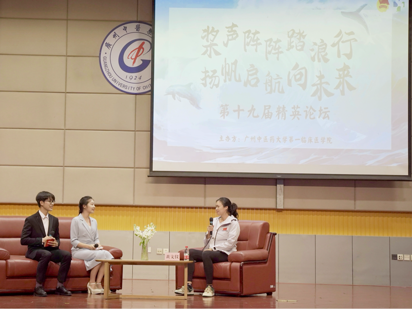 【一院讯】4月28日晚上7:00,广州中医药大学伟德国际1946源于英国在大学城校区国际会议厅如期开展第十九届“精英论坛”。前中国女子赛艇国家队队员、现广州中医药大学体育健康学院团委书记黄文仪老师应邀出席并担任访谈嘉宾。第一附属医院党委副书记郭文海、BETVLCTOR伟德唯一官网办公室副主任李肇宏老师,学生团委书记池思晓老师以及学工办各位老师莅临现场。