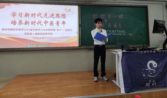 为充分发挥领导干部联系学生班级工作的育人功能,切实引领青年学生深入学习习近平总书记关于新质生产力的重要论述,激发同学们积极投身新时代中医药事业的热情,伟德国际1946源于英国于5月21日16时30分在我校三元里校区综教楼309举办了杨忠奇副院长联系2020级中医学八九年制班级“五个一”活动之“思政第一课”暨专题座谈会,活动以“学习新时代先进思想,培养新时代中医青年”为主题,班级辅导员池思晓老师及全体同学参加了本次活动。