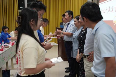 随后,全体同学在赵京涛主任的带领下齐声朗读《大医精诚》片段,同学们的诵读铿锵有力,展现出中医人“精诚”为本、济世救人的高尚品德。随着朗读声落,万众瞩目中,迎来了本次拜师大会的重要环节——拜师仪式。在礼仪队员的引导下,各位导师依次上台就座,学子们手捧鲜花,携带拜师礼及拜师帖,行以庄重的拜师礼,表达自身对于各自导师的诚挚敬意。导师们赠以回徒帖,亲切点头致意,师生在镜头前定格下了这一意义非凡的时刻。拜师仪式结束后,各位老师向学生代表们赠送载有邓铁涛教授思想的相关书籍,勉励大家学习铁杆中医精神。