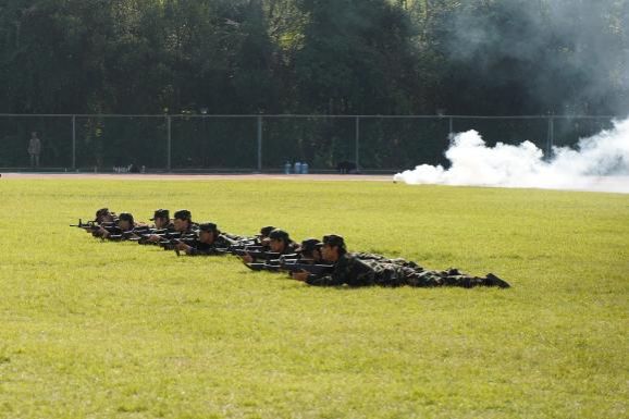 在嘹亮的军乐进行曲中,我院一、二、三新生连队迈着铿锵步伐,依次从主席台前行进。他们昂首挺胸,整齐划一的排面犹如秋风拂过的麦浪,层层涌动,气势恢宏。阳光下,那淌过汗水的脸颊,褪去了年少的懵懂,这份坚毅恰是青春向少年的庄重告别。那坚定的眼神,仿佛在诉说着他们的成长与蜕变。