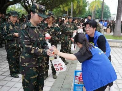 烈日炎炎,艳阳当空,一院学子的军训热情丝毫不减。他们在训练场上刻苦训练,卓越的表现令人赞叹。为鼓舞新生军训热情,传递对军训场中汗水与努力的关切,9 月 12 日,我院精心举办“迷彩青春,温情相伴”军训慰问活动。院党委副书记郭文海及各位辅导员老师亲临大学城校区教学区田径场,他们关切地了解学生训练情况,亲切慰问 2024 级承训教官与参训学生,如一阵温暖的春风,吹拂着每一位学子的心。每一个学子用笑脸回报着一院学生会准备的礼物,温情蕴含在不言中。