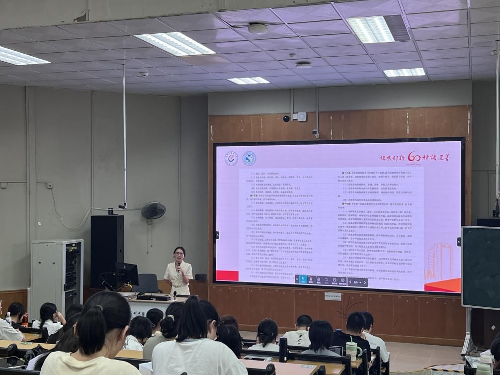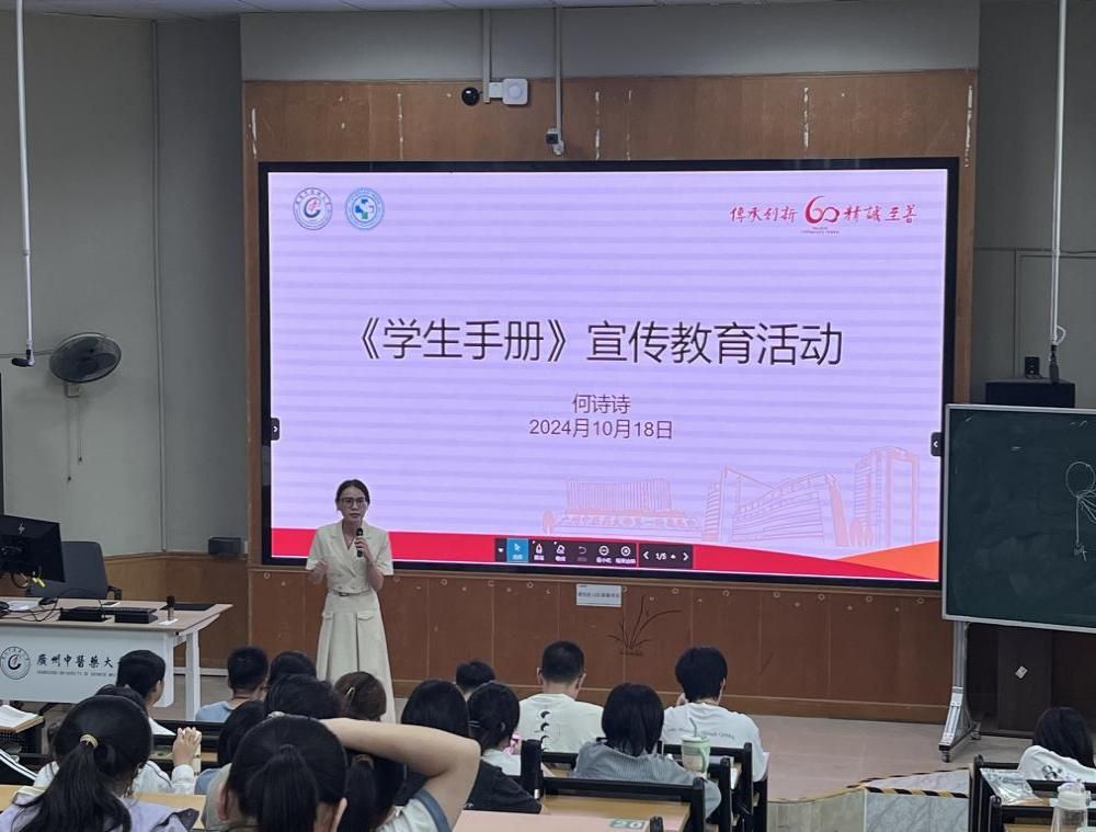 宣传教育活动采取了多元化的实施策略。在课堂上,何诗诗老师以“大学生的学习与生活”为主题,引领同学们踏上了一段知识之旅。她从学校的历史沿革、校训精神、校徽寓意讲起,不仅重温了广中医的辉煌历程,还细致解读了《学生手册》的核心内容,为同学们勾勒出一幅清晰的大学生活蓝图,使他们对个人目标的设定有了更加精准的定位。随后,在各班级班委的组织下,一场场以《学生手册》为主题的宣讲活动如火如荼地展开,同学们积极参与,共同研读了新版的《学生手册》,加深了对学校规章制度的理解与认同,为构建和谐的校园生活奠定了基石。