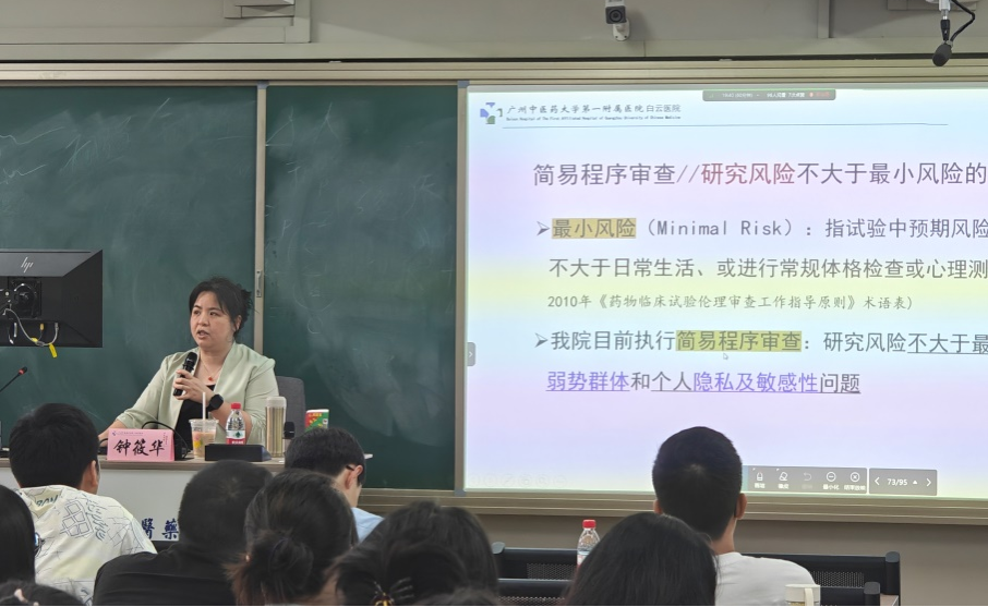 2025年4月10日下午,我院特邀医院伦理委员会教研分会主任委员钟筱华教授与委员秘书黄纯美老师,为全体研究生开展“临床研究伦理审查与受试者保护”“研究生医学研究伦理审查流程”专题讲座,教育教学部龙泳伶部长、研究生管理办公室申啸笑副主任出席讲座。此次培训旨在强化研究生临床伦理意识,筑牢尊重与保护研究参与者合法权益的制度防线,为培育兼具科学素养与人文关怀的医学人才奠定基石。