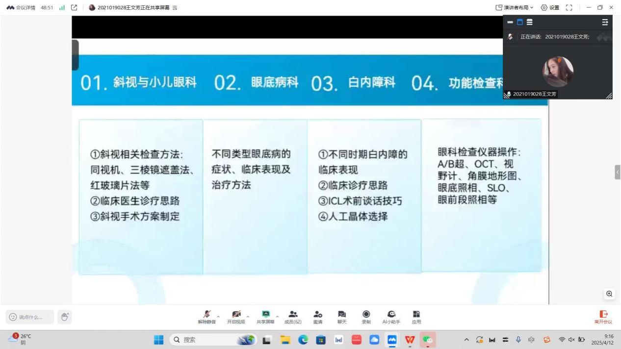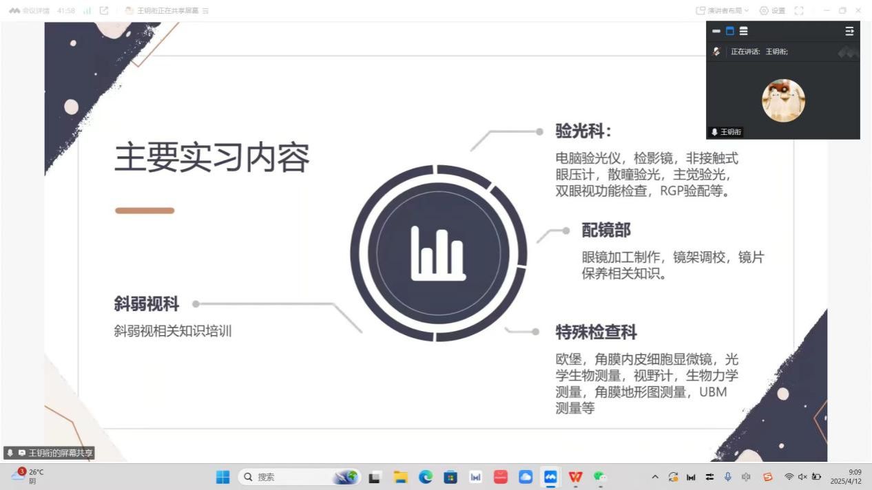 会议进入2025届毕业生展示阶段,谢育肖老师首先对2025届眼视光班在校情况进行了全面介绍。随后,五位2025届眼视光班应届毕业生代表分别对各实习基地和实习生的情况进行了汇报,他们结合自己的学习和实践经历,分享了自己的学习心得和未来规划,充满了对眼视光学事业的热爱和追求,展现了眼视光学专业学子的风采和魅力。