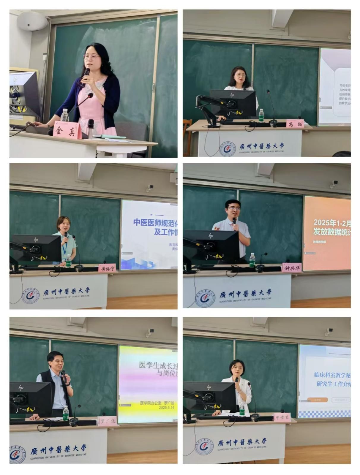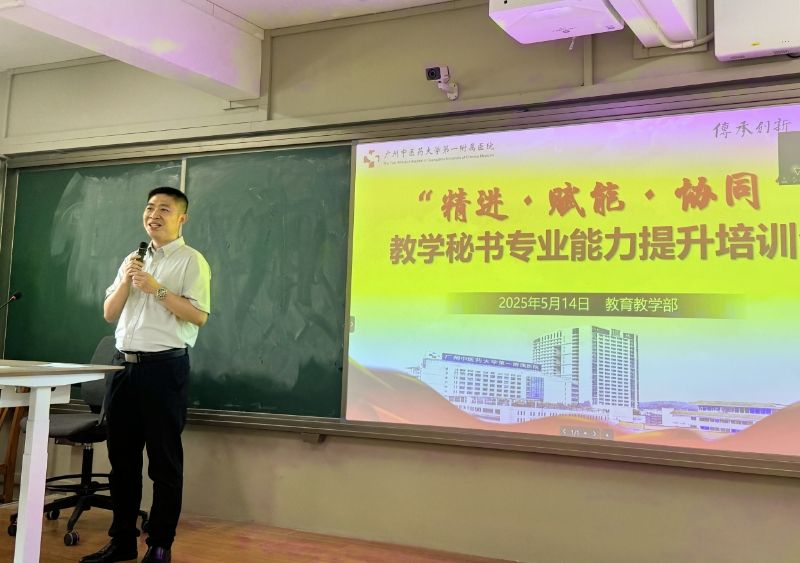 在专题培训环节,教育教学部6位老师结合自身岗位职能进行系统全面的专题授课。金真老师以“教研室教学秘书工作职责和规范”为主题,从教学计划制定、课程安排到质量监督,系统阐释了岗位核心职责;高颖老师围绕“本科生毕业实习管理与考核标准”,强调实习质量控制要点,为教学秘书提供了可操作的考核指导;罗广波副主任以“临床实践课程与岗位胜任力培养”为切入点,剖析课程设计与能力培养的深层关联,拓宽了教学管理思路;申啸笑副主任详细讲解了“研究生临床轮科(含规培)工作流程”,涵盖轮科安排、考核评价等核心环节;黄依宁老师结合中医规培特点,与大家一起解读“规培标准轮训要求与学员分配准则”,强化教学管理的规范化意识;钟兴华老师则基于详实的数据分析,对“规培学员绩效发放”提出了优化建议。