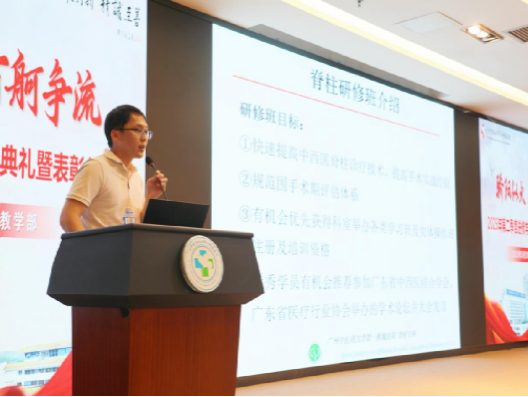 临床科室带教老师代表脊柱微创科莫国业老师分享了岭南脊柱中西医适宜诊疗研修班开办情况,从临床科室开班、带教老师授课到进修医师管理的全过程分享了自己的心得体会。他表示,脊柱微创科一直以来高度重视进修教学工作,在日积月累中形成了一套岭南脊柱中西医适宜诊疗研修班独特的工作体系,旨在能够为进修医师提供更好的教学和服务。