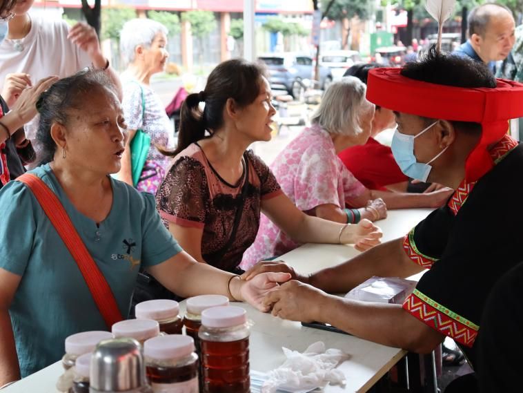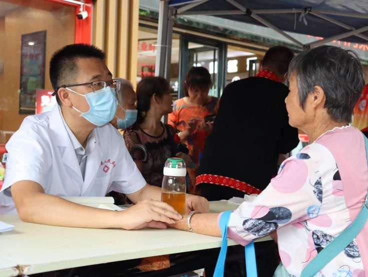 7月23日,三色谨队携手连南瑶族自治县中医院(瑶医医院),在连南县三江镇好宜家超市广场开展义诊活动,清远市中医院帮扶团驻扎在连南的1名中医专家及连南瑶医协会的3名瑶医师傅前往坐诊。钱医生耐心地倾听居民的身体不适及疼痛,结合病史及个人体质提供个性化治疗建议,瑶医师傅们则带来了瑶族独特的外治法,在简单的问询后,配以其行云流水的推拿手法为居民展开治疗。