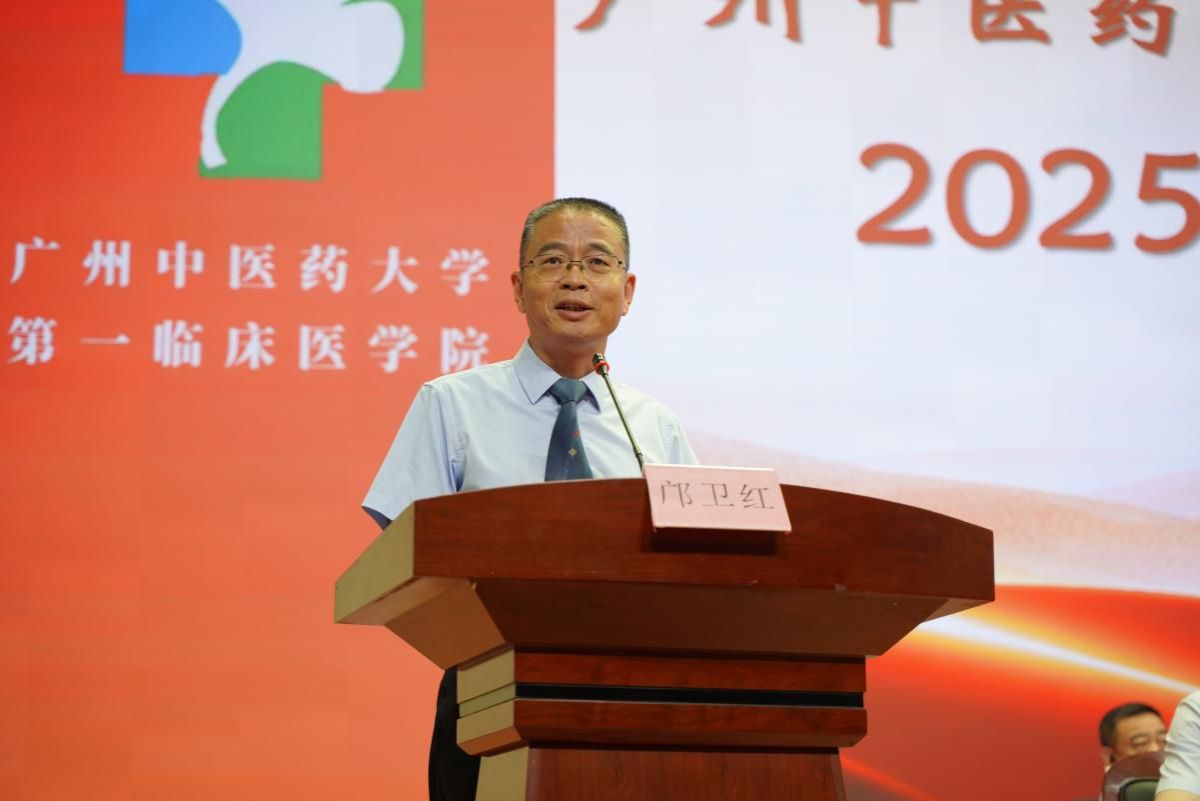 随后,学院党委书记邝卫红教授在讲话中回顾了医院60余年坚守“为人才培养而生”的使命,培养了邓铁涛、罗元恺等中医大家,他们在理论创新、师承教育及疫情防控中贡献卓著。医院科研实力突出,曾获三项国家科技进步二等奖,拥有四种“岭南名方”,制剂研发与临床转化成果显著。作为岭南中医龙头,一附院医教研协同发展,是广东唯一有毕业生成为国医大师的临床医学院。邝书记最后以老一附院人身份向新生分享了殷切期望。