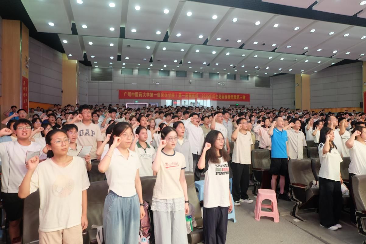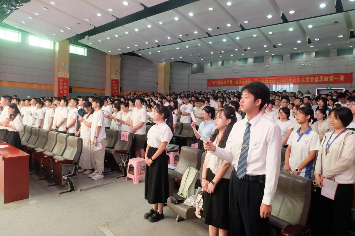 新生见面会上还举行了庄严的医学生宣誓仪式。国医大师周岱翰教授带领全体新生,紧握右拳,以铿锵之声郑重宣誓。字字坚定,句句铿锵,表达了他们对医学事业的赤诚初心与执着追求。这一刻,他们正式肩负起“健康所系,性命相托”的医学使命。宣誓仪式不仅深化了新生对职业神圣性的理解,更增强了他们的责任感与使命感,为今后漫长的医学征程奠定了坚定的信念基础。