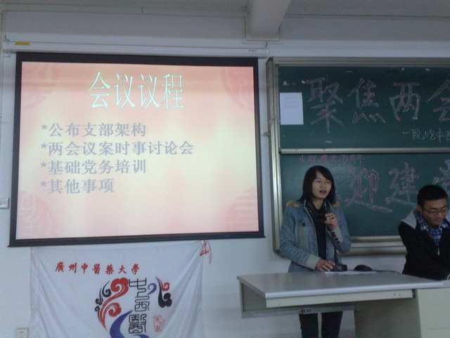 第三曲:跟党走。两会刚过,时下全国各地都在关注两会议案等。为此,我们在此之际举行了“‘聚焦两会,喜迎建党’讨论交流会”。党团员围绕“反腐倡廉”、“就业问题”、“物价”和“医疗改革”四个主要问题展开激烈讨论,同时分享温总理讲话、民众心声。 同时,辅导员黄晓其老师就就业问题结合自身工作经验向在座党团员介绍了此方面的最新信息并指出同学们应改变就业观念,适应社会发展。