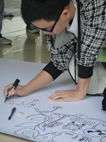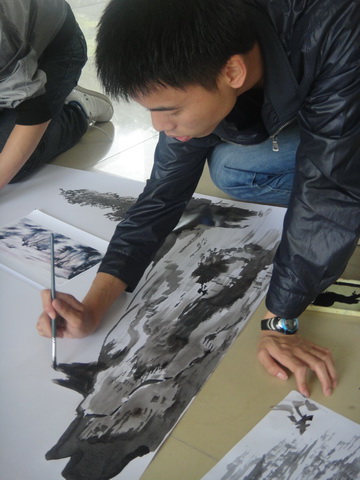 (图为10中医“凋落的翅膀”队伍的翁发扬同学在聚精会神地绘画,他们是参赛的7支队伍里唯一采用水墨画诠释主题的一组。)