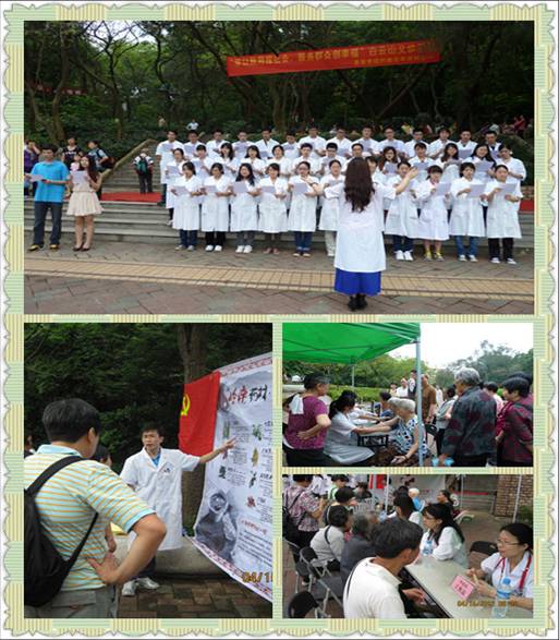 此次义诊中,有08中医党支部及08中西医党支部热心的党员同志们,更有我校第一附属医院的医生,他们不辞劳苦,也参与活动为社区居民们提供各种服务。活动当天,精彩不断。义诊区,我们医学生协助医生进行常规义诊活动,包括:(普内科、推拿科、保健科)帮病人看病、提供咨询。医学生帮市民们提供测血压、艾灸、针灸、拔火罐、帖耳穴、推拿等服务。活动开始就有一批早来的群众欣然接受我们的服务,向我们的医生询问生活中遇到的各种健康问题,医生们也耐心地对他们解疑答惑,提供切实可行的寻医治病之道。活动现场负责推拿按摩的同学们以精湛娴熟的手法为他们解除平日之劳倦。负责艾灸的同学送人以鱼更授人以渔,一边艾灸,一边教其如何在日常生活中用艾灸养生保健。精彩无处不在。在另一边,“齐齐来认药”的图片平台,展示精美的中医药图片以展示我国历史悠久的中医中药文化,让群众加深认识,从而宣扬更健康的生活理念。到了中午人流高峰期,活动现场是火热一片,不少群众在享受难得的舒适和放松过程,学习一些在实用的保健方法。还对中医保健表现出浓厚的兴趣。