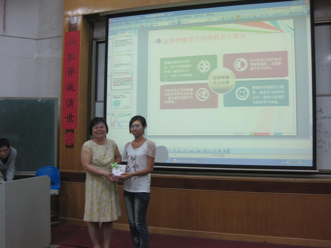 本次专业分化交流会分别介绍了妇科学、骨伤科学、肿瘤学、经典与临床,以及中医学等五个方向的相关情况。罗颂平教授讲述了开设中医妇科学的必要性与目的、课程设置、师资力量及教学特色;教学处谢翠英老师介绍了中医学方向的专业课程设置及教学模式;骨伤科教研室主任黄枫教授从学科特色、发展前沿和课程设置等方面对中医骨科作了详细介绍;肿瘤学教研室主任林丽珠教授介绍了肿瘤学的发展前景、科研成果、课程设置及就业优势;伤寒教研室主任李赛美教授强调了回归经典、活用经典的重要性,并介绍了该专业的课程设置、教学模式及历年的开班情况。每个老师介绍完专业情况后,同学们就相关专业问题踊跃提问,老师均详细地为同学一一解答。最后,班委代表全班同学为每位老师送上一份纪念品,表达同学们对老师的谢意。