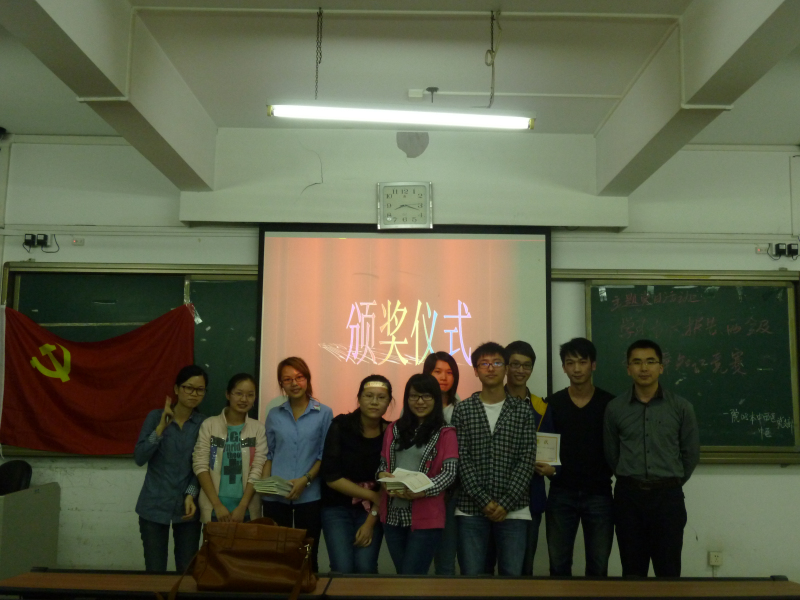知识竞赛分为小组赛和决赛。首先进行的是小组赛。此环节每个队全员参加,每队1份答卷,20分钟内完成,分数前四名的队和中医党支部代表队出线。试卷发下后各队队员紧张讨论快速作答,都争取在规定时间内完成。初赛结束,海贼王队、LAZY队、Together队、2+2队以高分出线,与中医班代表队一起顺利进入决赛。随后进行的是观众互动。题目以选择题或问答题形式给出,现场观众举手抢答,气氛热烈,答对者能获得小奖品。此环节重在加深党员同志对十八大报告、两会及新党章的理解。知识竞赛逐渐走向高潮。接着进行的是决赛。决赛分为选答题和抢答题。各队选手皆有备而来,表现出色。经过激烈的角逐,最终2008本科中医党支部凭借快速反应,赢取决定性的4分,获得本次知识竞赛冠军,全场为之欢呼鼓掌。而海贼王队则屈居第二,但虽败犹荣,而第三名则被2+2队获得。黄晓其老师为三支获奖队伍颁奖,并与其合影留念。