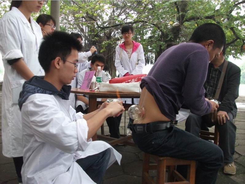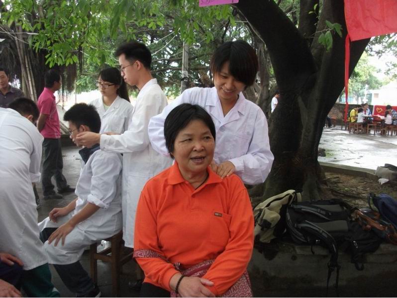 早晨的天气很好,南亭江畔来往着晨运的人们。同学们熟练地准备好物资,迅速把现场安排好,迎接村民的到来。村民们看到我们的到来,不再是带着疑虑在不远处观望,而是热情地来与我们交流,向我们询问关于健康养生的各种问题,同学们十分热情地为村民们解答。一次次的周末义诊,同学们与村民从当初的陌生到现在的熟络,与村民之间的情谊越来越深厚,清晨的南亭江畔洋溢着欢乐温馨的气息。随着时间的推移,义诊活动进行得如火如荼,量血压、艾灸、推拿、拔火罐等义诊服务广受村民喜爱,同学们都忙活得不可开交,但与村民们的有说有笑使我们忘却了身体的疲劳。在义诊的同时,随行12级的师弟师妹们十分积极地在一旁认真学习,身为师兄师姐的同学们耐心地教导着他们,学有所成时也会忍不住亲身实践,村民们也很乐意提供机会让我们学习。