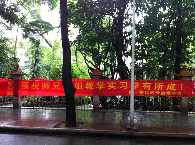 5月10日上午7点,芒果路上已经堆满了大大小小许多行李,同学们仍在挥汗如雨地从宿舍楼上往下搬行李。“预祝师兄师姐教学实习学有所成”、“祝一院人扬帆起航新征程 铸就人生新辉煌”,芒果路上的横幅赫然在目。这是一年一度的教学实习启程的日子,一院2010级本科及09七年制共计482名同学,今天将奔赴省内21家医院,完成为期三个月的教学实习任务,这也是他们期待已久的一次身临其境的临床学习机会。