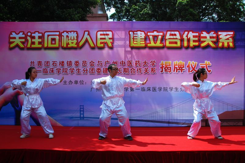 上午9:00,义诊刚开始,群众们就闻讯而来,熙熙攘攘挤满了广场,纷纷向医生咨询各自的问题。10:30时,在古朴传统的八段锦表演后,石楼镇党委委员伍清文同志和院党委郭文海副书记先后致辞,挂牌仪式正式开始。华丽的舞台布置,动听的乐队音乐,贴心的志愿引导,多样的服务项目,专业的医师咨询,受到群众们的交口称赞。在番禺电视台的现场采访中,石楼镇党委委员伍清充分肯定了我院志愿服务队为海鸥岛居民所作的贡献,希望我们继续加强合作,为当地群众带来更多的志愿服务。院党委郭文海副书记也衷心感谢石楼镇对我院社会实践工作的大力支持,希望通过挂牌后建立更加密切的合作关系,为当地群众提供更好的医疗服务,为学生提供更多的锻炼机会。
