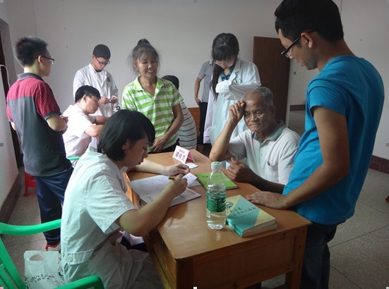 2013年7月15日早上,在广中医大学城生活区装载着一支热情洋溢、朝气蓬勃的队伍的汽车徐徐发动,拉开了为期七天的“涌动河源,筑梦上义”三下乡之旅的帷幕。经过了三小时多的路程,大家来到了四面大山环绕、稻田飘绿的河源上义镇,受到了当地领导的热烈欢迎。当天下午便在当地计生服务站开展了服务村民的义诊活动。活动过程井然有序,村民们在服务站门口排队等候挂号,然后在下乡队伍的队员引导和陪同下进行量血压、诊病、拿药。来义诊的村民络绎不绝,一位当地老婆婆对下乡队员竖起大拇指,赞:“大学生关心农村、关心农民,好!”