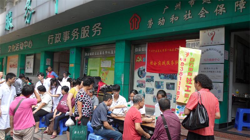 2013年9月14日同学们迎来了新学期第一场“中医走进社区”义诊活动。此次活动地点由以前的天河区陈静俱乐部转变为越秀区白云街,而组成人员除了我们10中医班的同学外还加入了11中医班的师弟师妹。这不仅将义诊的福利转移和扩大,同时也为之注入了新鲜血液,使“中医走进社区”的活力能够生生不息,很好地将光芒放射到更远更广。
