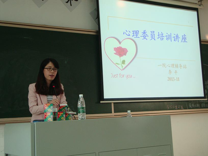 在这秋冬交接寒气渐逼的时节,一院心理辅导站李平老师为各班心理委员和心理辅导站成员上了一堂丰富有趣的心理健康知识普及课,为同学心中送来缕缕阳光 .2013年11月7号下午,踏着下课的铃声,一院各班心理委员及辅导站成员又匆匆赶往教学楼A511。当所有人就座后,李平老师便出现在大家的视线中。