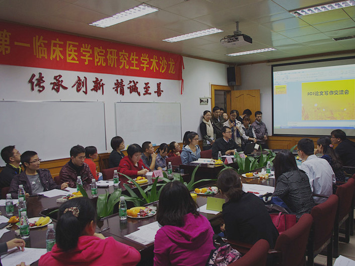 交流会中,2011级中医内科学专业博士刘勇介绍了个人成功发表SCI论文的经验,包括SCI论文写作的辅导用书、文献检索、写作顺序与注意事项等,重点介绍了获得实验结果后对有效资源信息整合与利用的方法,分享了临床经验与SCI论文写作相结合的心得体会。2012级中西医结合基础专业博士黄丽平亦毫无保留地与同学分享自己的写作技巧,深入剖析了写作的突破点,将自身对基础实验研究的心得和理解娓娓道来。SCI写作的话题激起了大家的热烈讨论,每位同学或根据自身的体会或根据自己的理解来共同探讨、共同交流,现场气氛非常活跃。