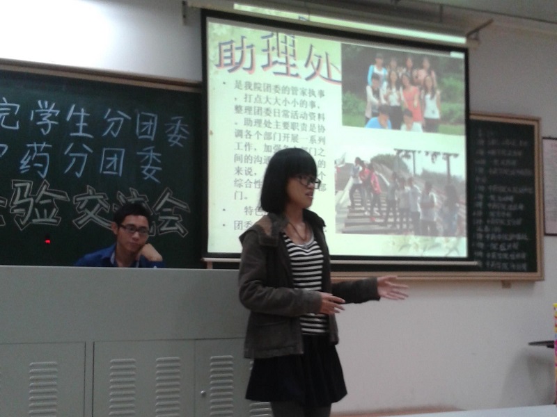 在两位副书记总结过后,各部门分别就各自的工作内容,工作中积累的经验以及工作中遇到的难题及其解决方法展开交流,现场气氛热烈。我院学生分团委的许多新干事纷纷向中药学院团委的师兄师姐取经,各位师兄师姐也将自己的亲身经验倾囊相授。出席成员之间相互交换名片,并留下各自的通讯方式以便今后交流学习。