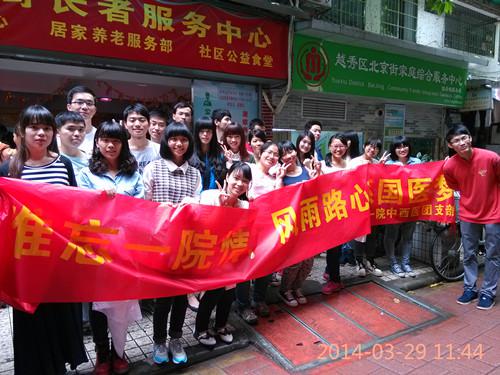 2014年3月29日早上八点许,同学们来到越秀区北京路雅荷塘家庭服务中心附近,通过派发传单、口罩和健康知识问答的方式向该社区的居民普及防御禽流感的相关知识。尽管天公不作美,但是同学们依然冒着小雨向路过的社区居民普及关于“正确认识和防御H7N9型禽流感”的知识,并传递“飞沫是传播流感病毒的元凶,戴口罩能防御飞沫传播甲流”理念,同时赠予居民口罩。不少接到口罩的居民向同学们表达感谢,并表示对流感疾病的认识又进了一步。此外,因临近一附院50周年院庆,志愿者们还向居民们宣传、介绍我校第一附属医院,部分居民向一附院献上了贺词和祝福语。