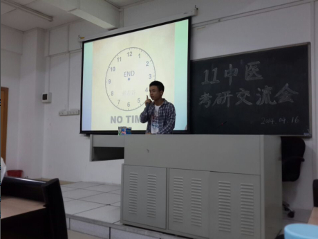 2014年4月16日晚,一院11中医班考研交流会在综教楼305教师举行。会议邀请了赖若谷和成业两位研究生师兄为我班同学介绍了考研的具体事项和流程,并为我们解答考研的相关问题。