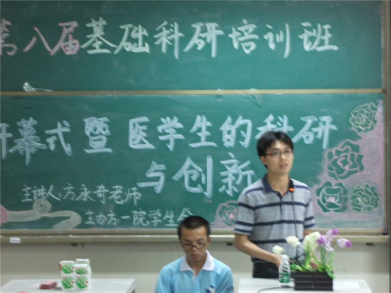 4月16日晚,伟德国际1946源于英国第八届学生基础科研培训班开班仪式在大学城综合楼201举行。第一附属医院实验中心主任方永奇应邀作第一场讲座,题目为“医学生的科研与创新”。BETVLCTOR伟德唯一官网办公室主任钟天送和辅导员陈文桂出席开班仪式。
