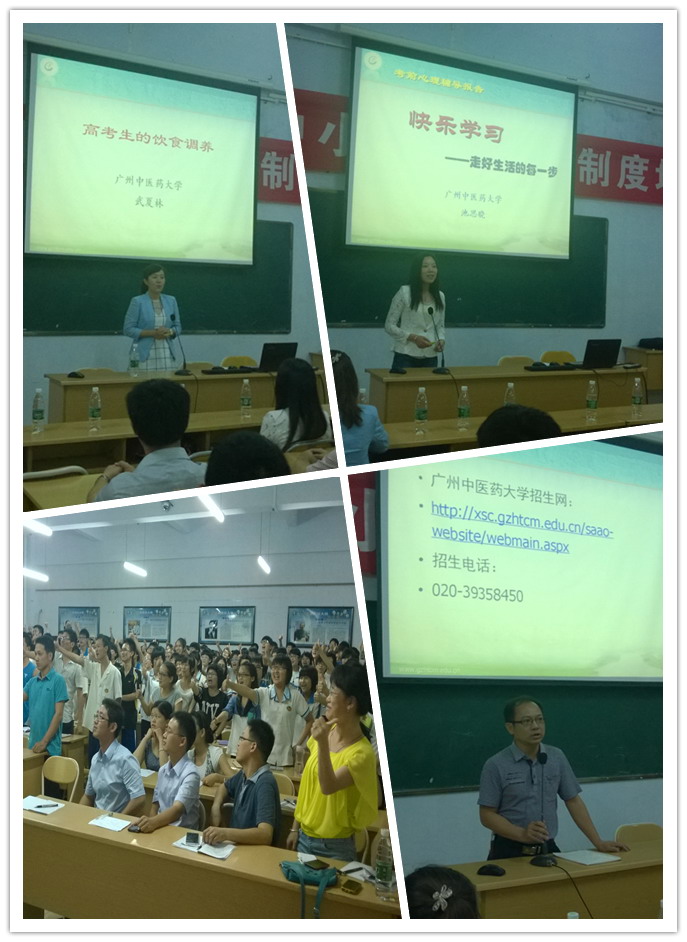 随后,该校高三实验班的近两百名同学、高三年级老师和部分家长代表参加了讲座。讲座中,武夏林老师通过讲授保健三部曲的方式将中医药的特色和优势介绍给了师生及家长们,同时为考生们在考前的健康饮食提出了中肯的意见和建议,尤其是各种中医手法的利用,让考生们获益匪浅;之后池思晓老师以“快乐学习”为主题,通过心理的经典案例和图片让考生们知道了应如何面对考前的各种心理问题,用积极的心态去处理好各种压力,积极的去面对高考。