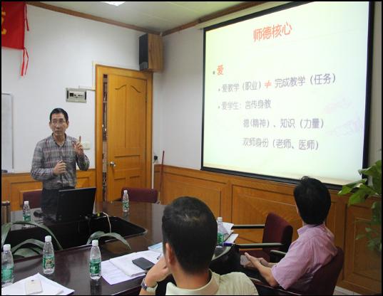 接下来的“师德”大讨论环节真可谓“百家争鸣、百花齐放”,各个教研室师德标兵和老师都均尽情阐述自己的见解。骨伤科教研室师德标兵代表黄枫主任认为师德的核心就是爱和奉献,以双师(教师、医师)身份,全身投入,言传身教,授人以渔;内科学教研室师德标兵代表吴伟主任从仁、和、严、勤、精、新等多个维度阐述了一个师德高尚的教师应该具有的综合素质;金匮教研室师德标兵代表刘晓玲教授讲述了自己通过各种渠道以师德影响教育学生,如课间播放修身与感恩的PPT,课余倾听同学的心声、为同学及家属免费诊疗疾病,推荐同学课余观看《医道》,去体会一个大德名医成长的历程,潜移默化影响着同学去形成一个健康、平和、快乐、进取的人生观……