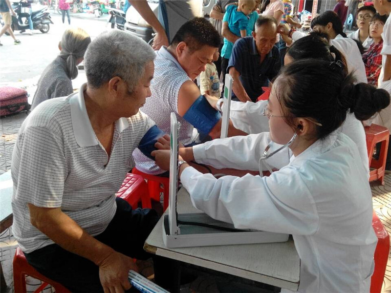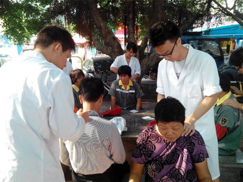 活动刚开始,有一批清洁工阿姨过来找我们,我们给他们按摩、量血压、递上热腾腾的花茶。而宣传组的同学就带着我们精心编制的中医宣传小册子走进菜市场,进行宣传。随后,一些大叔、阿姨、老人家陆陆续续地来了。就这样,义诊现场坐满了人,人群涌动,每个小组的同学都热情积极地给他们服务,真是一片和乐融融的场景。在给村民服务的过程中,我们也跟他们谈谈家常,说说笑笑,听听他们在生活中的困惑。为村民带来的不仅仅是身体上的舒服,还有心理上的愉悦,村民对我们的服务都很满意。