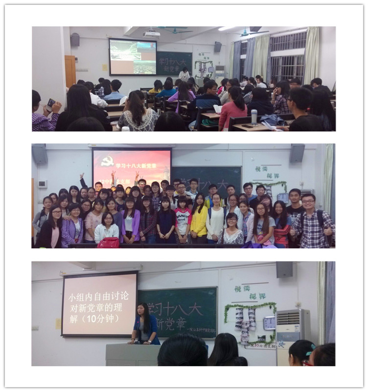 在活动现场,该党支部书记池思晓老师首先强调了学习党章的重要性,总结了以往同学学习党章的不足之处,端正同学们学习党章的态度,为本次党章学习奠定了良好的氛围。接着由主讲人预备党员梁明心同志给大家详细温习了党章的主要内容,并特别指出了党章修改的部分,然后将其归纳总结为6部分内容进行了详细讲解,期间穿插课堂提问和时事政治的讨论,与此同时,现场氛围活跃,同学们积极举手回答提问,一小时的学习党章时间很快就过去了,同学们充分地学习了党章知识,加深了对新党章的认识,并从中体会到了“温古而知新”。个人的思想觉悟得到了进一步提升,更加坚定了向党组织积极靠拢的决心。