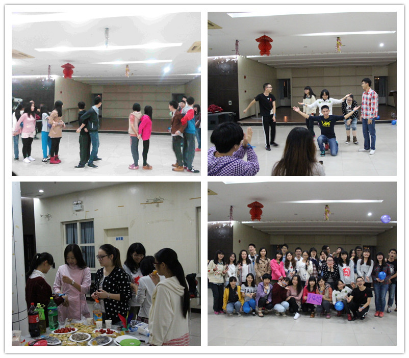 “幸福之约”主题晚会以全体班委表演当前倍受欢迎的“小苹果”舞蹈拉开了帷幕,紧接着由主持人带领大家进行了4个游戏环节。第一个环节是“我的幸福我来猜”,由一人比划,另一人猜,考验的是两人默契。活动过程中,有些小组成员忙得指手画脚,对方却只能干瞪眼,惹得观众都着急;而有的小组成员彼此间却心有灵犀,观众们看着直叫好。第二个环节是“走幸福之路”,游戏双方背对背夹着气球,从出发点越过3个障碍跑向终点,最后双方用身体力量将气球挤破。这一路走来,有人走的磕磕绊绊,不是丢了气球,就是走得别别扭扭,闹出了一堆笑话;而有的人却配合的很好,一气呵成,以惊人的速度率先到达终点。第三个环节是“口不对心我最棒”挑战赛,即嘴说的数跟手比划的不能一样,否则要吃芥末寿司作为惩罚。大家都说这是个费劲的游戏,开始还能控制自如,但随着节奏的加快,都无法招架了,最后受惩罚的人吃着芥末寿司,一把鼻涕一把泪,尽管如此,大家却表示游戏挑战了自我,也赛出了快乐。第四个环节是“一元五角幸福抱团”,男、女生分别代表5角、1元,当主持人喊出一个金额时,在场所有人必须在十秒时间要抱成正确数字。该环节把整个游戏活动都推向了高潮,同学们一听到指令就不顾形象扑过去抱团,生怕筹不够规定金额得遗憾出局。在疯狂的幸福抱团活动中,同学们抱出了欢乐,也拉进了彼此的距离。激动的游戏结束后,同学们一起分享着班委事先准备的各种美食,并留下各种欢乐的合影。