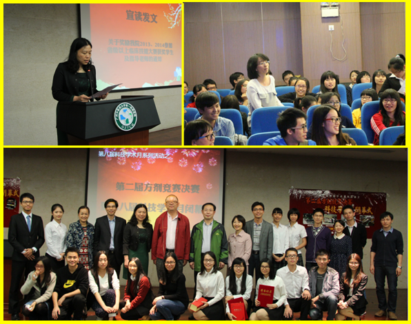 经过初赛的严格淘汰,共有来自八个班级的八支队伍的24名选手进入方剂学决赛,决赛包括“非你莫属之必答题”、“斗智斗勇之抢答题”、“步步惊心之风险题”、“战神争霸之一站到底”等环节。随着PPT精彩画面的展示,各队伍的竞赛宣言如雷贯耳,台下各班级亲友团加油助威。主持人为现场观众准备了12道方剂题目和小礼品12本《方剂知识宝典》,现场观众抢答正确则获得礼品,将比赛推向第二个高潮。