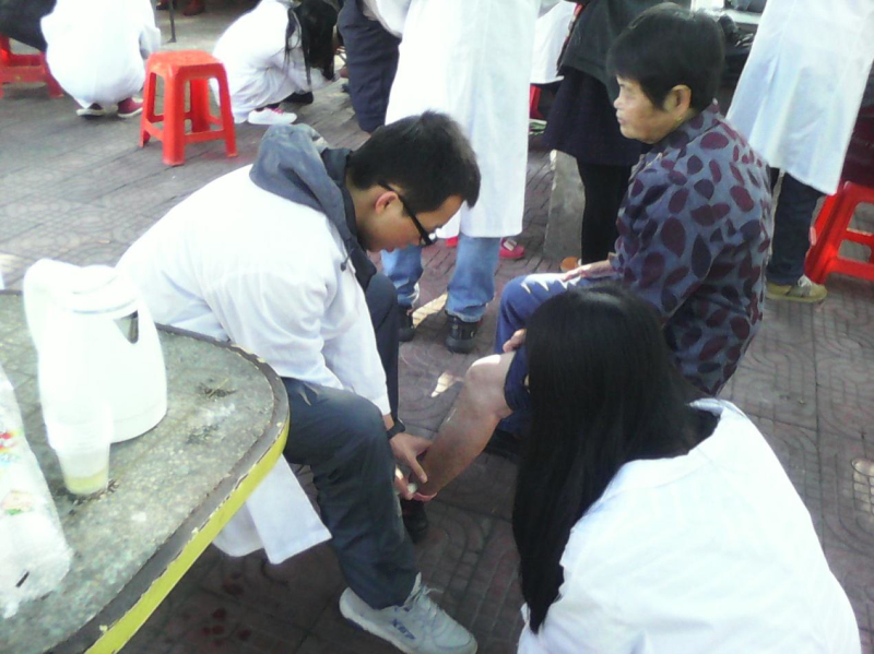 义诊项目还是常规分为血压组、推拿组、艾灸组、花茶组以及体质评估和心理测量组。早冬的寒气在早晨尤为逼人,前来量血压的街坊要脱掉厚厚的外套,艾灸足三里的爷爷奶奶要把裤腿卷起,还好有热气蒸腾的花茶飘散暖气,还飘着香气。在义诊过程中,我们对血压高的叔叔提出了如何保持血压等建议;对腿疼的奶奶,我们对她进行艾灸,满意的笑容让我们激动不已;而对前来咨询的叔叔,我们用所学的知识完满解答了他的疑问。短短几个小时的义诊就这样充实而愉快地度过了。