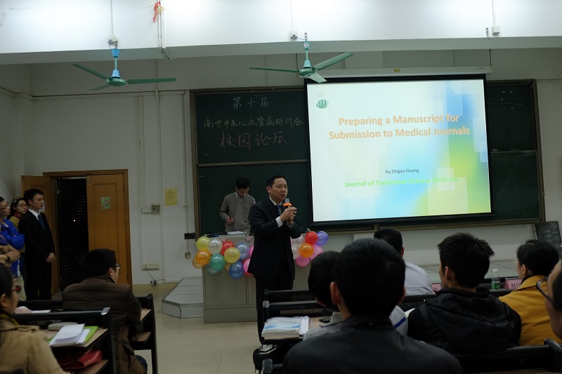 本次论坛共分为三个部分。在第一部分中,刘红旭教授分享了他对于RCT与注册研究的认识,通过自身经历揭示两种研究方法的利与弊,指出了当前对于各种研究方法的认识误区,为在场的师生理清了研究工作的障碍。第二部分由刘国正社长主讲,刘社长通过大量的数据向在座的师生介绍了当前国际与国内主要的科技期刊的排名与发展情况,并以《中医杂志》主编的身份向各位师生提出了“选题创新,论文高引”的建议,阐述了当前核心科技期刊的征稿要求,提示了广大师生未来科研的走向。第三部分的主讲人是《中医杂志》英文版主编、《中医杂志》社副社长黄志高先生,在黄副社长的分享中,他凭借生动而接地气的表达方式与丰富的真实案例,阐述了他对于外语学术论文的写作要求,经过他对每一部分的拆分讲解,在场的听众都对科技论文的撰写有了新的认识与更深刻的理解。在论坛的最后一项内容是一附院内科教研室组织的方剂知识有奖竞答,在场的同学们都表现出了极高的热情,同学们扎实的方剂学知识功底也给老师们留下了深刻印象。