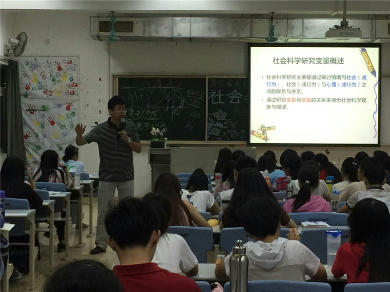 马教授首先走到学生中间,与大家展开了亲切交流,并采取提问的互动方式活跃了气氛,拉开了本次 讲座的序幕。他通过风趣幽默的语言,讲述名人事迹历史史实,向学员们强调了论文思维性的重要性。接下来,马老师向大家娓娓阐述,阅读一篇文章,前言很重要,假设是核心,最重要的是讨论——真正能够体现作者的思想与逻辑推导过程,是非常值得读者反复斟酌思考的。同时,他也谈到要关注数据的提出,尽可能地对比前人已有成就进而提出自己想法;看论文一要关注题目,二要关注摘要。之后,又借用居里夫人的例子向我们论述了做科研是枯燥的,但更多的是鼓励我们去坚持,有奉献专注精神,敢于尝试。接下来,老师灵活地应用了生活中实际热门的例子、高级精密的数学公式和生动形象的图像,为大家展示了典型易懂的研究设计,进而系统详述了变量的类型,主客体存在引发变量,多个变量间的相关关系;指出社会科学实证研究的实质即是探讨变量之间的关系,强调了变量在科研论文中的作用。