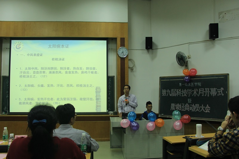 会上,朱章志教授上台进行经典晨读动员讲话,用激情澎湃的话语为同学们讲述了中医无穷的魅力和熟读经典的重要性,同时还特别强调经典中医入门的唯一办法就是背和坚持,朱教授还带领现场全体同学们一起诵读《伤寒论》中的经典条文。