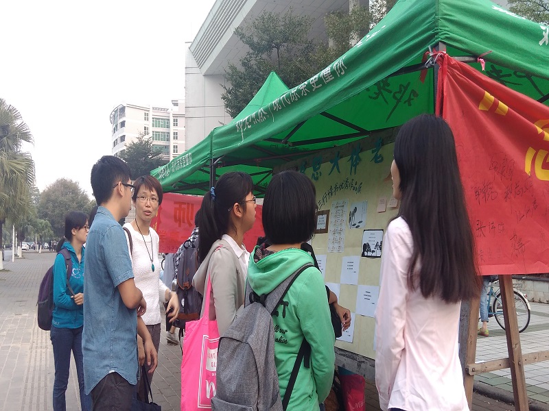 活动现场,帐篷下,悬挂着用于签字横幅;展板上,张贴着优秀三行情书作品和有关“大体老师”的简介和照片。凉风袭来,虽透着丝丝寒意,但来往的同学们都积极响应。他们在三行情书前驻足,看着那庄严而沉重的照片,倾听工作人员的耐心讲解,深深触动着各院学子的心灵。他们满怀感激和敬重之情,并将这份情感流注于在横幅上书写的一笔一划,留言墙上深情的语言展示着学子们对“无语良师”大爱无疆的敬佩。那满满的名字,那简短的语言,满载着学子的感激,和对“大体老师”祭奠、默哀。