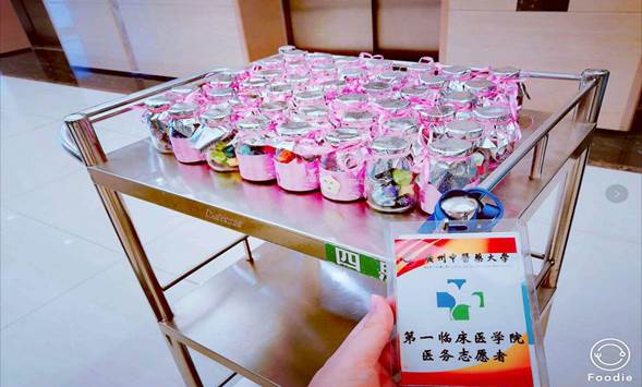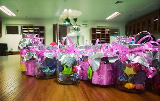 九九重阳志愿行,满满病房医患情。今天的志愿者工作除了查房就是为患者医生护士们亲手做小礼物,礼轻情意重,纵使乍一看并不值钱,但也是集思广益,用心制作。白蛋白瓶的清洗、幸运星的制作、干花爱心滴胶的制作以及最终的装饰,无不蕴含着我们的心意。进入病房送礼物其实也是一个学习的过程,礼貌、用语、肢体语言、察言观色等等,最重要的是自信和勇气,首先要勇敢地踏出那一步,不然在脑海中构思再多逻辑清晰的话语都是徒劳。患者大都中老年,收到礼物后基本都是处于很开心的状态,看到他们的笑容就觉得这些天的努力还是值得的,特别是查房时感觉心情不太好的,收到幸运瓶时嘴角一扯,明眼人都知道坏心情瞬逝,那一刹那仿佛世间都变得美好(易苗)。