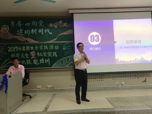 2019年6月17日19:00,“青春心向党,建功新时代”2019年暑期社会实践活动动员大会暨社会实践技能培训在大学城校区综合楼201举行。第一临床医学院党委张念樵副书记、团委叶升鑑书记;BETVLCTOR伟德唯一官网办公室钟天送主任、团委李平副书记、BETVLCTOR伟德唯一官网办公室刘文红老师、何丽老师、张晋老师、陈文桂老师、杨穗嘉老师以及附院急诊中心刘诗怡老师、各暑期社会实践队伍代表约150余人参加了大会。