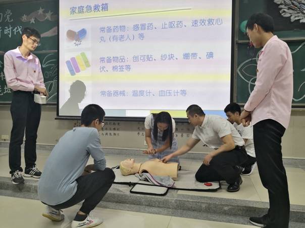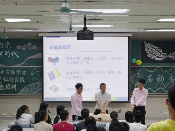 社会实践培训讲座邀请广州中医药大学第一附属医院急诊中心主治医师刘诗怡老师介绍暑期社会实践常见急症处理,刘老师详细的讲解了包括心肺复苏术和猝死、噎食、电击、烧烫伤、淹溺等常见事故的急救方法,并现场手把手教同学们操作步骤,同学们收益良多。