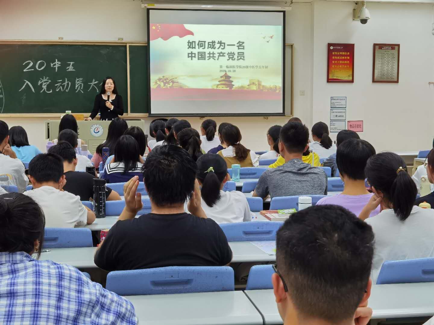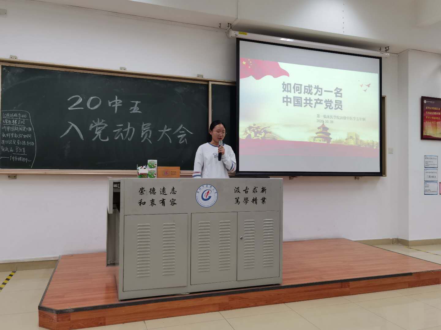 【一院讯】2020年10月28日下午,伟德国际1946源于英国2020级中医学五年制团支部于教学楼A215召开了以“如何成为一名中国共产党员”为主题的入党动员班会,年级辅导员池思晓老师出席了本次会议。本次会议旨在通过对中国共产党的相关知识介绍,以及入党流程的讲解,动员广大青年学子积极向党组织靠拢,在党的领导下不断提升自我,成为党和国家合格的建设者和接班人。