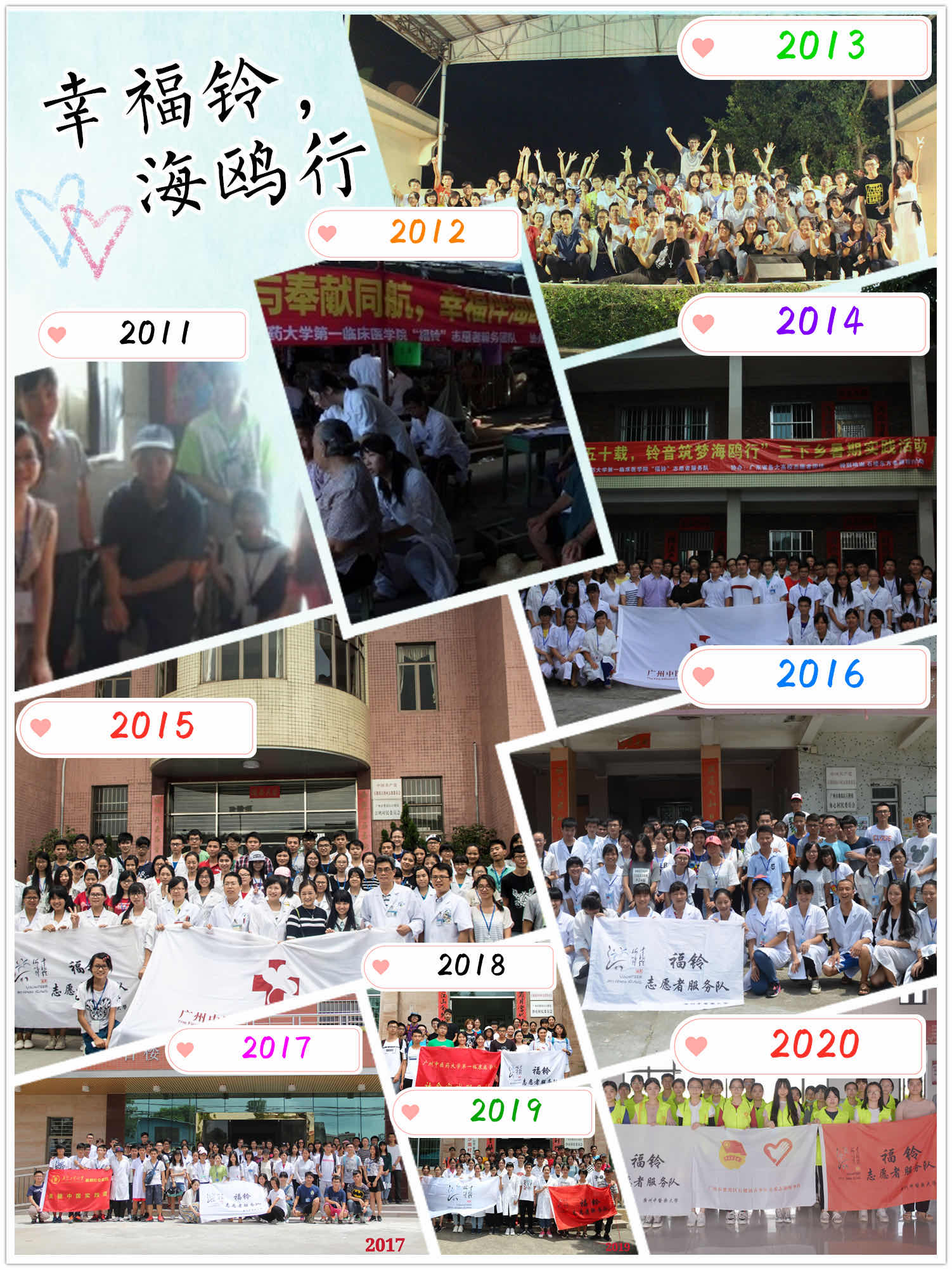 “幸福铃,海鸥行”,作为我院的一支品牌实践团队,“福铃志愿者服务队”自2011年建队起,已经在番禺海鸥岛开展了十年的暑期社会实践活动。十年里,已有超过700名“福铃人”参与到志愿服务中,开展了义诊、义教、义演、科普宣教、调研、低碳环岛骑行等活动达80余次,服务时长近60000小时,惠及超过1万名的当地百姓。多样的项目,优质的服务,受到了当地人民的热烈欢迎,更得到了当地村委、政府的肯定,丰硕的实践成果,也争相被各大媒体宣传和报道了100余次。而十年的志愿服务之旅,不仅助力了海鸥岛的发展与变迁,也见证了福铃队成长。2011年至今,队伍已多次荣获“校级优秀社会实践服务队”称号、6次荣获省级重点团队和优秀团队称号、2次入围全国暑期社会实践优秀项目计划,今年更是荣获国家级的优秀团队称号,满满的荣誉,既是一份肯定,也是一份激励,下一个十年,福铃人必将以更新的思路,更高的要求,继续在海鸥岛服务当地百姓。