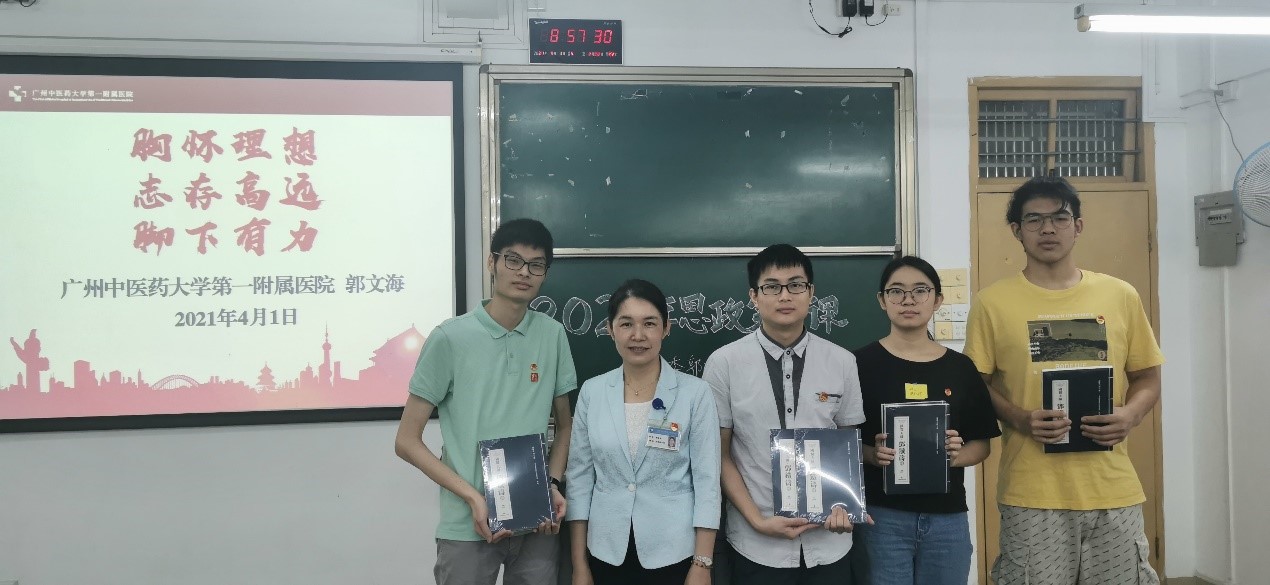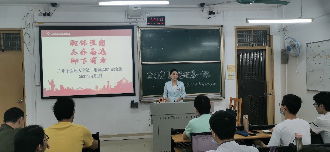 2021年4月1日上午8:00,广州中医药大学伟德国际1946源于英国(第一附属医院)党委郭文海副书记在三元里校区新课室楼201为一院2018级中医学五年制的同学讲授一堂主题为《胸怀理想 志存高远 脚下有力》的思政第一课。